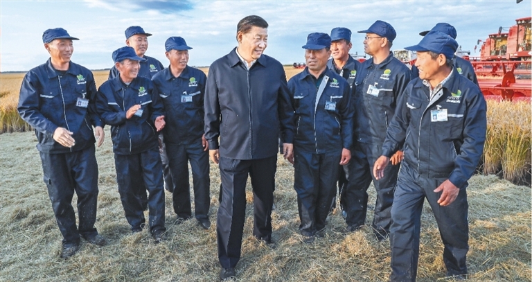2018年9月25日,习近平在七星农场万亩大地号与农场工人们亲切交谈。 新华社发
