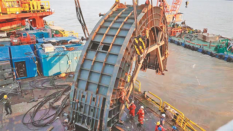 第一步,打捞人员从打捞船上把端板顶梁组合体吊入长江口水下,沉入泥中预设位置;