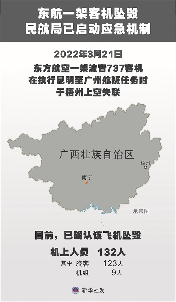 记者21日从民航局获悉,2022年3月21日,东方航空一架波音737客机在执行昆明至广州航班任务时,于梧州上空失联。目前,已确认该飞机坠毁。机上人员共132人,其中旅客123人、机组9人。