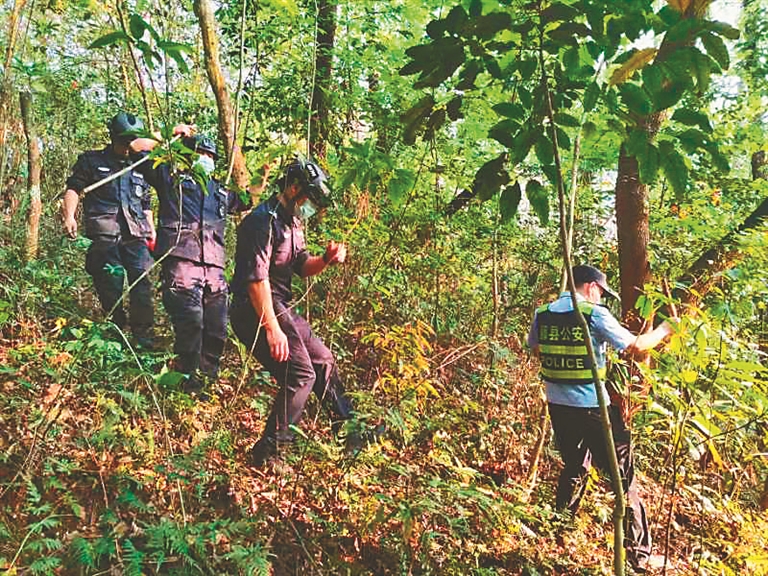 广西藤县公安局民警在坠机现场周边搜救(手机照片)。新华社发