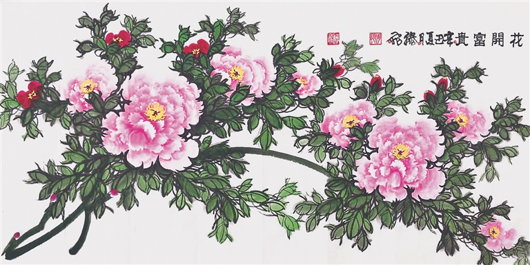 滕飞 《花开富贵》 国画 68×168cm