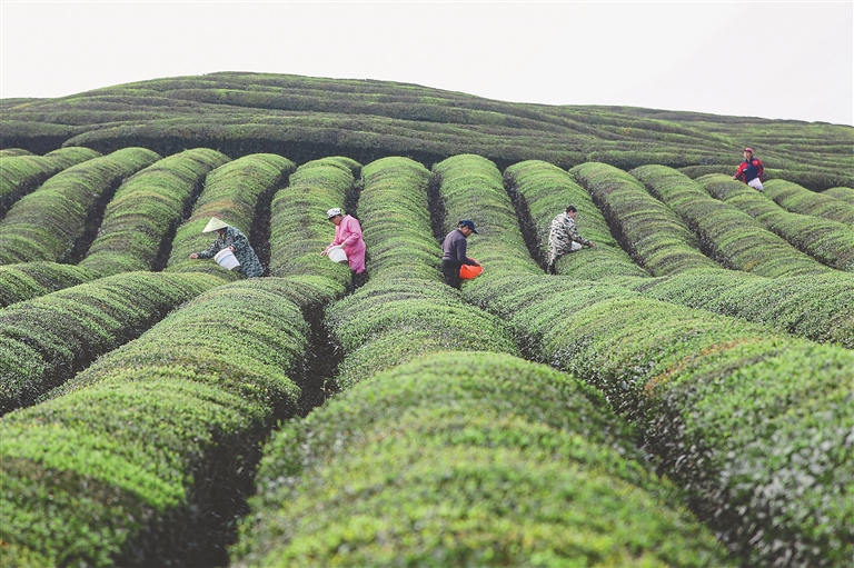 3月24日,在江西省宜春市上高县新界埠镇一茶场,村民采摘明前茶。