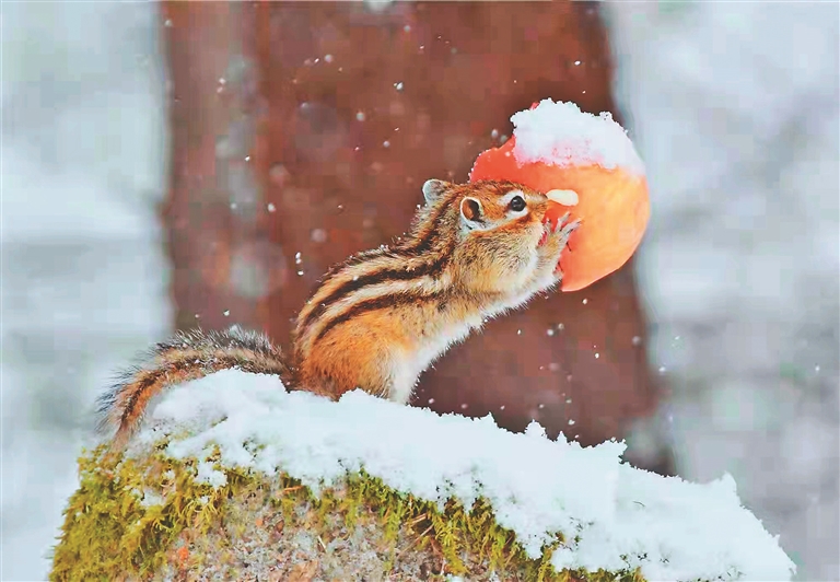 2021年年末,伊春少见的奇寒,且雪大。时至今日,积雪尚未完全化尽,天空偶尔还会下雪。此时,在伊春北山公园,花栗鼠们在林间欢快地迎接春天。