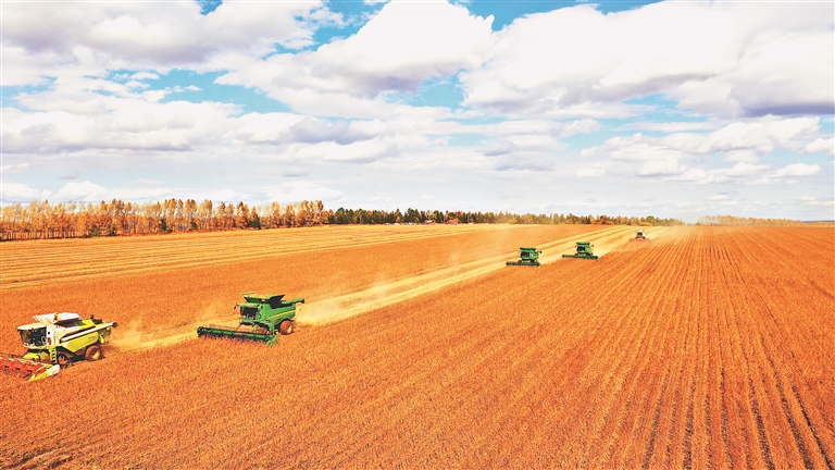 九三分公司优质大豆收获场景(资料片)。 张天露摄