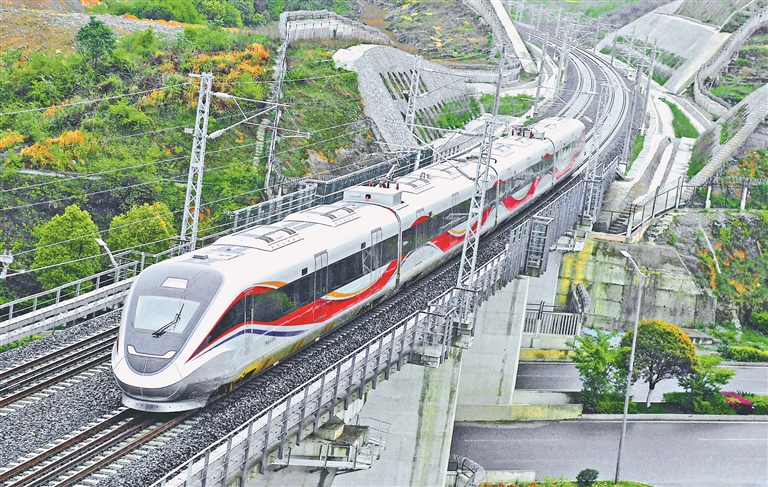 3月30日,动车组列车行驶在贵阳环城铁路天河潭一号桥上。