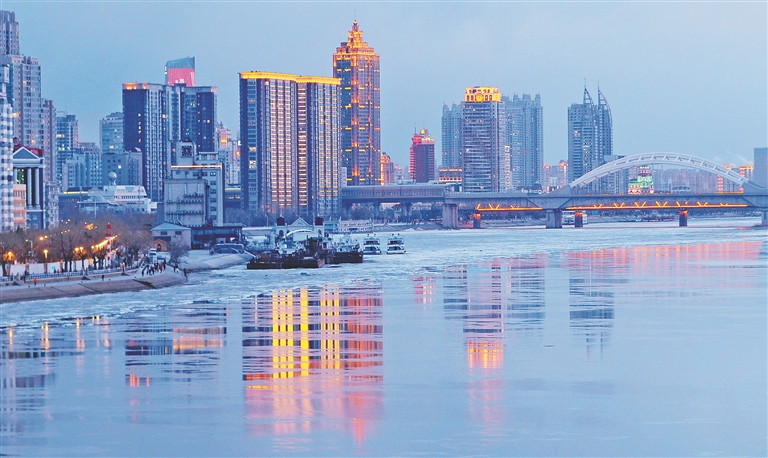 在大风与升温的持续作用下,封冻的松花江干流哈尔滨城区段已经开化。近两日,道外江段出现流动的冰凌,一块块大大小小的冰排顺流而下。傍晚,新融的江水倒映着两岸建筑,印衬着冰城多姿多彩的身影。