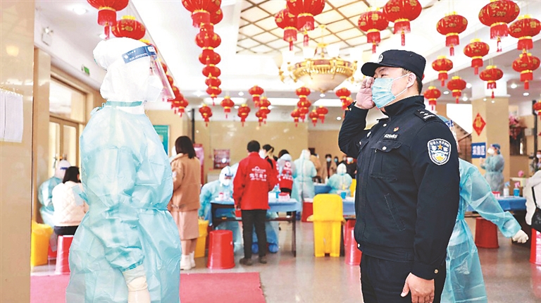 谁能想到,夫妻俩时隔多日的短暂团聚竟是在岗位上。4月3日,哈尔滨市开展区域核酸检测。夫妻俩都被分到了平房区东安文化宫核酸检测点位。妻子身着防护服给群众采集核酸,一做就是大半天;丈夫在不远处的一旁,维持现场秩序,站好“安全岗”,一站也是大半天。他们时常忙得连一句话都顾不上说,只能偶尔用眼神望向对方。
