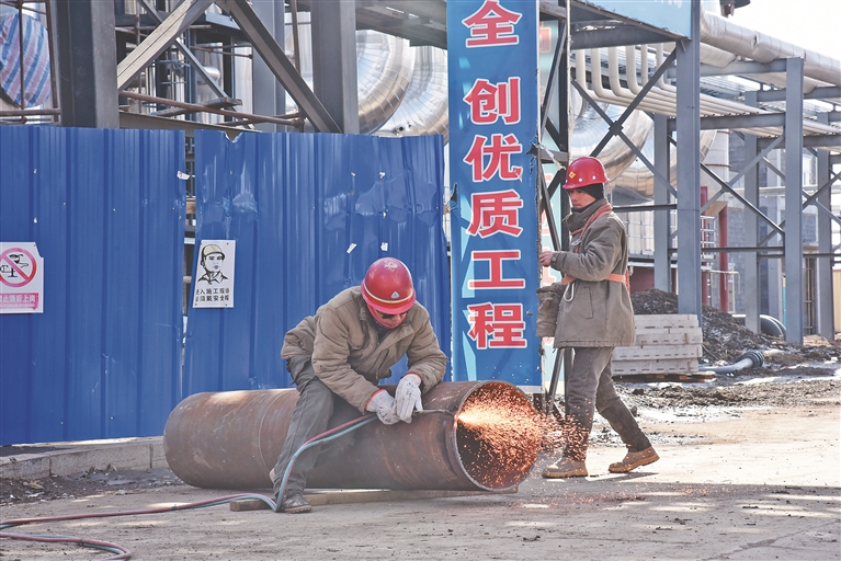 在鸿展热电联产项目现场,工人正在施工。