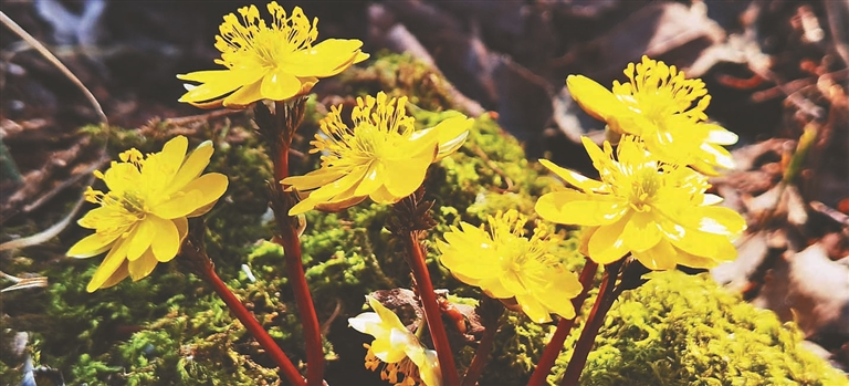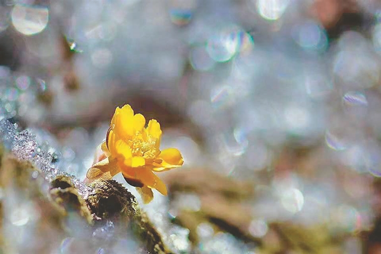 近日,在凤凰山景区,一朵朵黄艳艳的冰凌花傲雪盛开。小小的金黄色的花朵,顶冰而出,傲寒挺立,为北国的春天增添了浪漫的色彩。