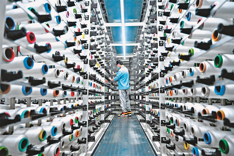 4月12日,在福建泉州石狮市的一家纺织企业,工人在工厂里忙碌。新华社发
