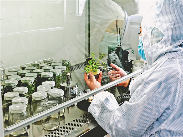 技术人员查看薯苗生长情况。 代梦迪摄