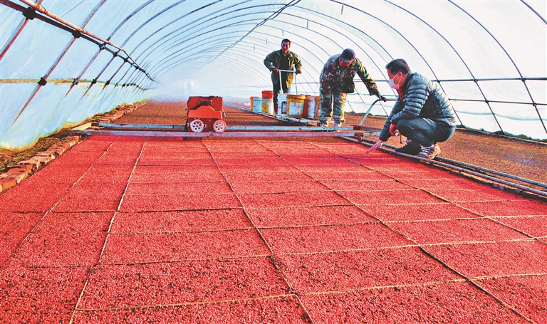 种植户在水稻育秧大棚里进行高标准播种作业。