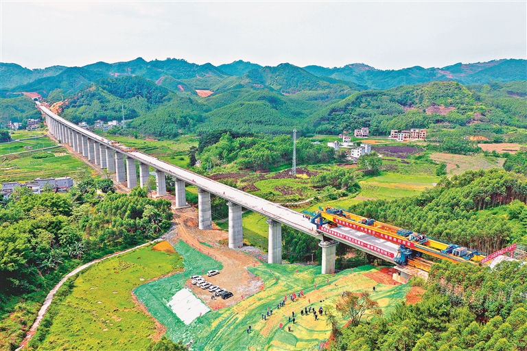 当日,位于广西马山县的贵南高铁位升双线特大桥最后一榀箱梁架设施工顺利完成,标志着贵南高铁广西段正线桥梁工程全面竣工。