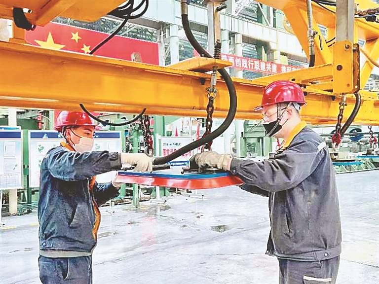 两名生产人员调整天车吸盘。 黑龙江日报全媒体记者 韩丽平摄