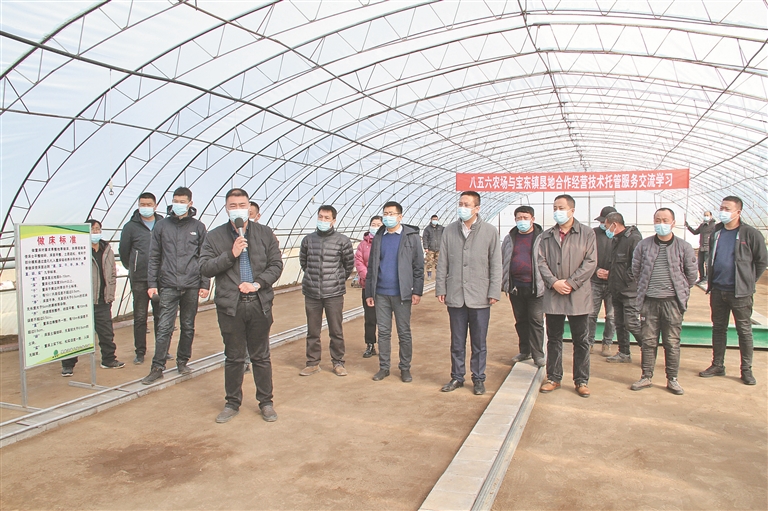 在虎林市八五零农场的超级大棚里,农场技术人员正在为前来学习参观的宝东镇技术人员、种植户讲解水稻苗床调酸要求。同时,新做床技术、摆盘标准、新覆土设备也是轮翻上阵,令宝东镇技术人员、种植户们赞不绝口,现场就与农场技术人员交流起新技术、新设备的使用特点、作业优势。
