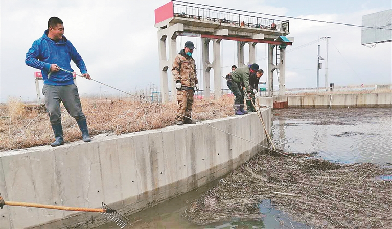 工作人员在干渠上清淤。 黑龙江日报全媒体记者 孙伟民摄