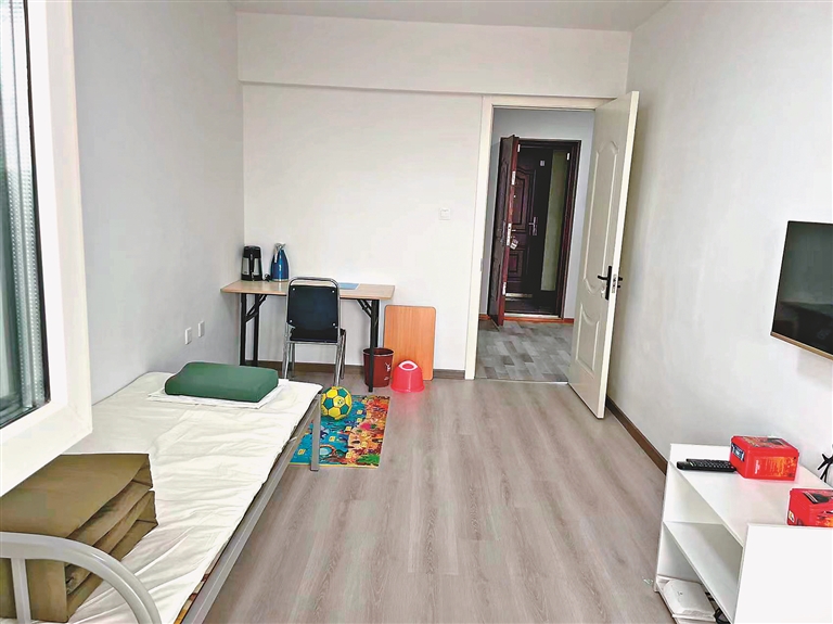 记者发现,为了适应各类群体,健康驿站内还精心设置了母婴房、老人房及无障碍房间。不同于普通房间,母婴房内设置了两张床,铺设了儿童地垫,布置了玩具。“为提高隔离人员的居住舒适感,尽可能减少排斥情绪,我们在每个楼层设置母婴房、老人房和无障碍房间,在标准化配备的基础上加设陪护床位、玩具、轮椅缓坡及坐便助力装置,让这个‘临时的家’充满暖暖的爱。”项目副指挥王伟峰告诉记者。
