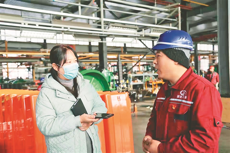 佳木斯本土企业骥驰机智产品投产,王冬(左)在车间采访研发人员。焦勇摄