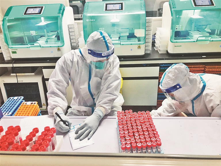 5日,进入鉴成国家P2级实验室,隔着玻璃窗可见身着防护服的检测人员正在对当日采集运送过来的核酸样本进行样本核收、样本编号、样本加样、样本核酸提取等工作。