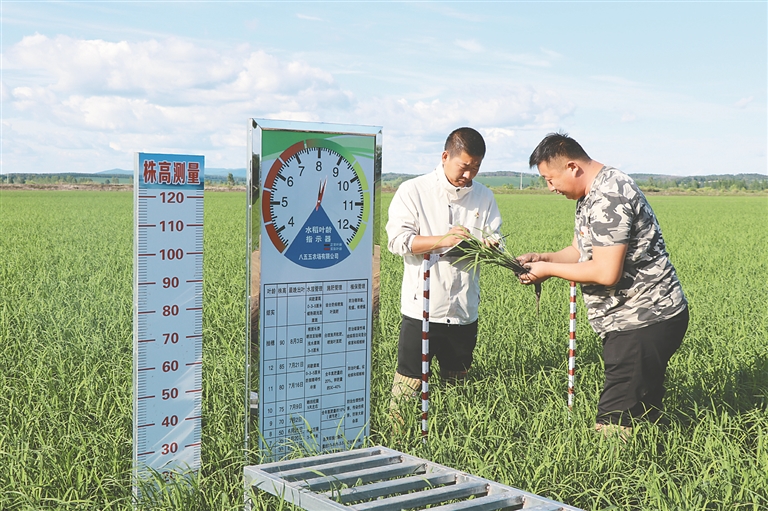 农技人员查看八五五农场有限公司二区10作业站水稻生长情况。于爽摄
