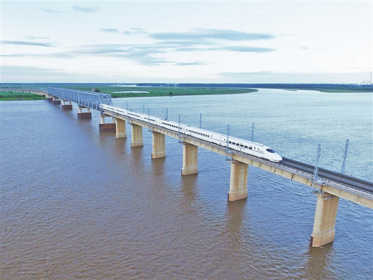 综合检测列车驶过佳鹤铁路佳木斯松花江铁路特大桥。