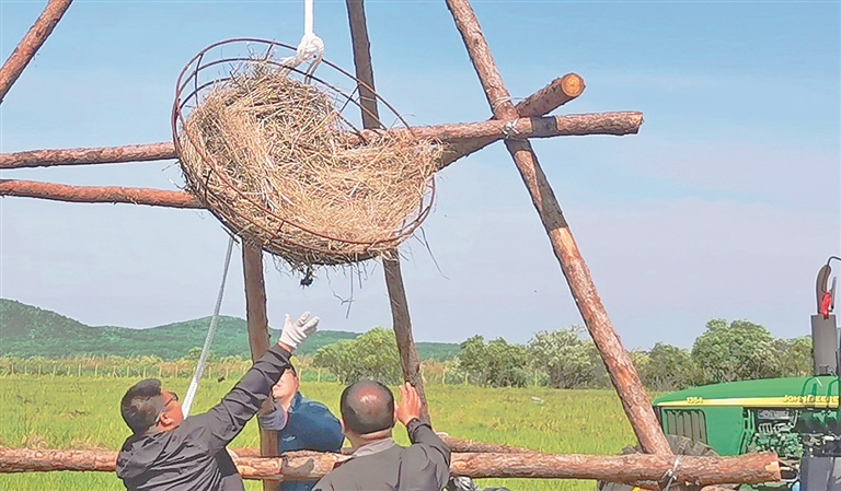 本报讯(王志弘 郭丽伟 黑龙江日报全媒体记者吴树江)近日,记者从北大荒集团胜利农场有限公司获悉,湿地管理服务站的工作人员在挠力河国家级自然保护区胜利农场境内为东方白鹳搭建了30个人工招引巢,让这些珍稀鸟类有了温暖舒适的“新家”。