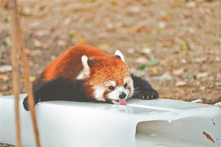 7月15日,上海野生动物园的小熊猫在冰块上避暑。