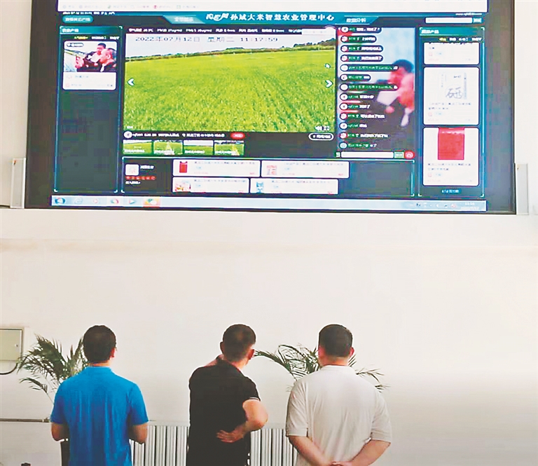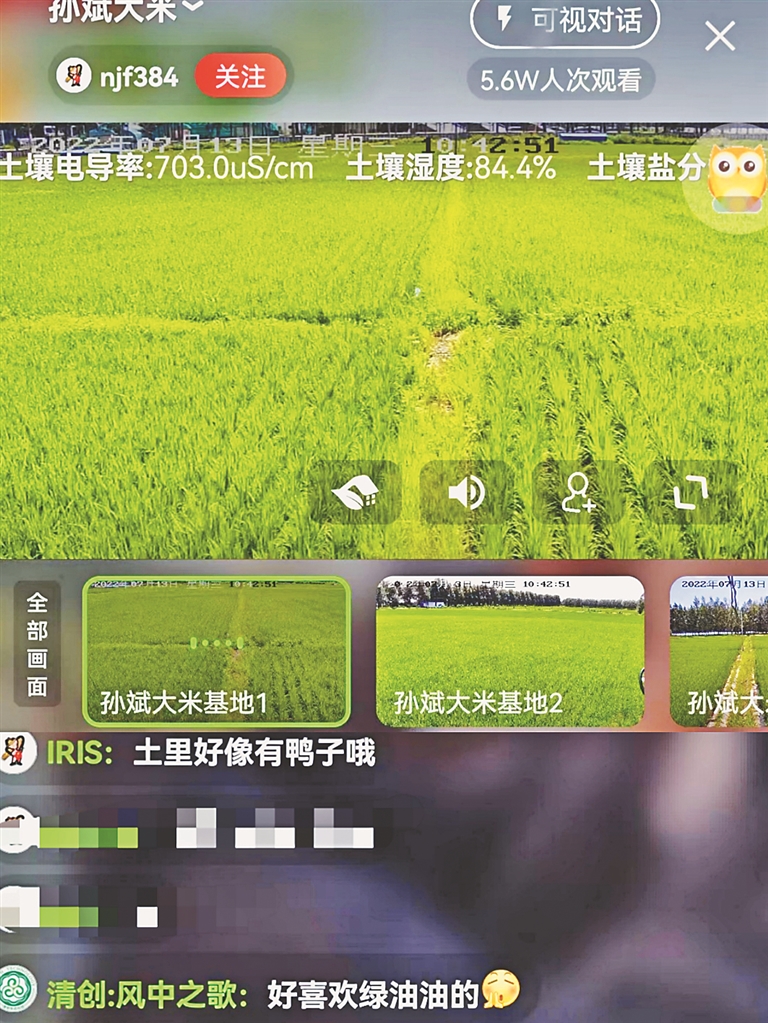 “知道吗?现在看田里长势的不止咱俩。我们正开着直播呢,现在有5万多人在‘云’围观稻田长势。”孙斌指了指机器上的摄像头,并将手机递了过来。