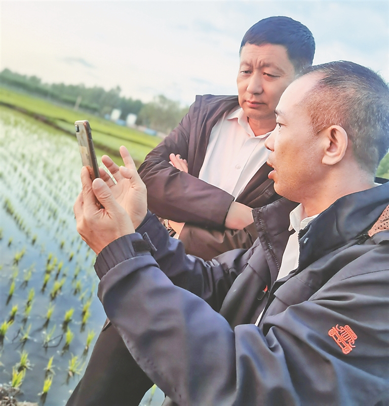 孙斌(右一)从手机查看水稻长势。