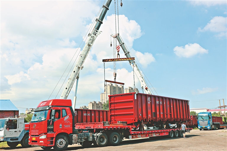出口蒙古国铁路货车在厂区整备发运。