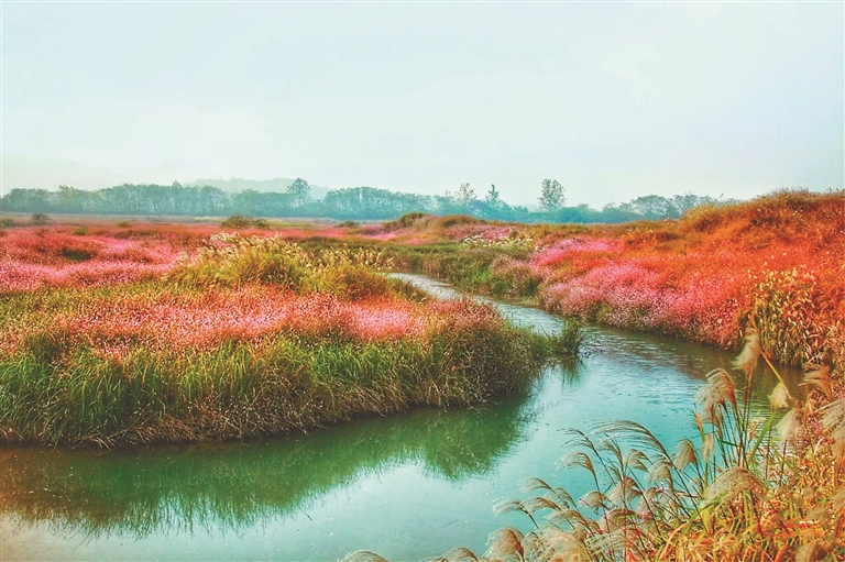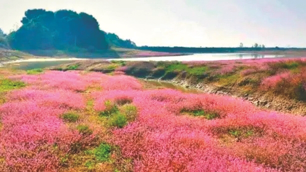偷得浮生偶闲,寻得游湿地赏花兴致给自己,是节假里人们不错的选择。徜徉在盛开护堤花的河滩上,花团锦簇,鹤鸣鸟啁啾,同江上渔歌相和,幻化出这里特有的清灵之气。默望几十亩、几百亩的护堤花花繁映日是何等的波澜壮阔。静听,清风吹着花朵沙沙娑娑,宛如纯真少女抚弄秀发款款走来;细闻,随风而动弥漫的花香或浓或淡,或许此时的花蕊、叶片有着鲜活的生命,经阳光、江水的润泽产生出如此生机盎然的味道,让人沉醉如梦;凝视,雍容而英挺,娇艳吐蕊,早有蜻蜓立上头。蜜蜂、蝴蝶也在飞上飞下,紧张地采着花蜜。站在高处放眼望去,湿地上的护堤花广无边际,风来翻卷红色艳,片片花海浩浩荡荡,动人心弦。穿游于枝枝密密的花丛之间给人一种愉悦和快感,花的美丽是大自然赐予人类的特殊奖赏,在这里人们的心灵得到净化。