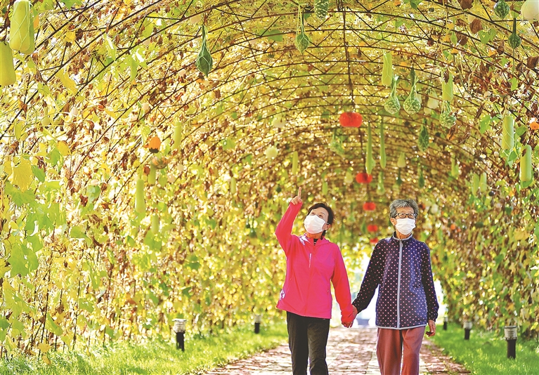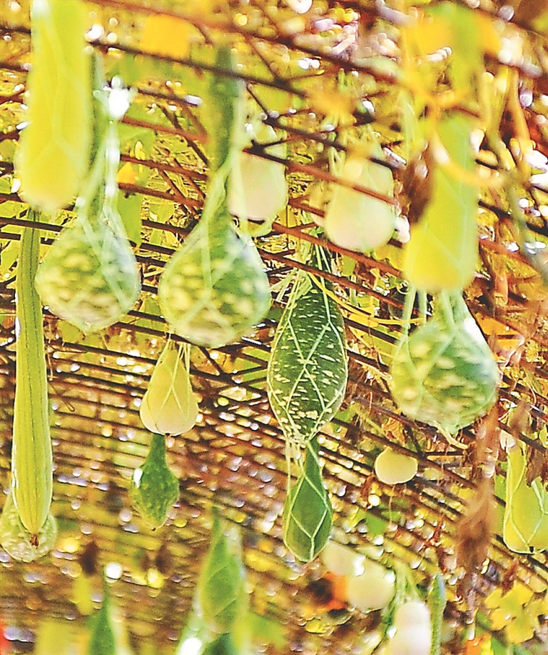 冬瓜、南瓜、丝瓜、葫芦瓜等瓜果沉甸甸地挂满枝蔓。这些瓜有长的、短的、圆的、扁的,形状不同,颜色各异,吸引了许多市民前来观看,拍照。