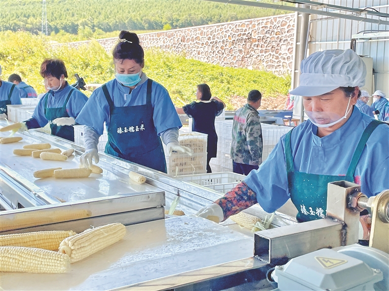 秋日当空,新兴区金沙街道十分场专用路附近的田野里,一排排玉米掀起滚滚绿浪,几台茎穗兼收玉米收获机在田间往来作业,工人们正忙着把一棒棒鲜食玉米装上车。