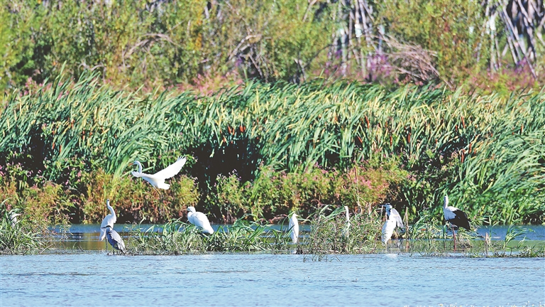 在抚远市滨江公园人工修复的湿地内,一处大约3平方公里的池塘里,汇聚了东方白鹳、白鹭、苍鹭、白骨顶鸡、绿头鸭、鸳鸯、江鸥等十几种被列入《国家保护的有益的或者有重要经济、科学研究价值的陆生野生动物名录》中的一、二级保护动物,可谓是鸟界“明星”荟萃。