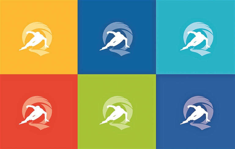 图标的中心和视觉重心是短道速滑运动健儿滑过弯道的剪影,肢体舒展、矫健有力,倾斜于字母“Q”之中,好似穿越奥运之环,又似冲出通往未来的拱门。