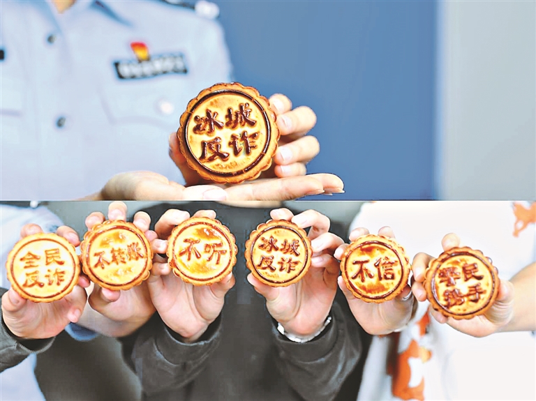 反诈月饼 冰城反诈民警自创反诈月饼,送给市民。王洋 张鹏 本报记者 蔡韬 李爱民摄