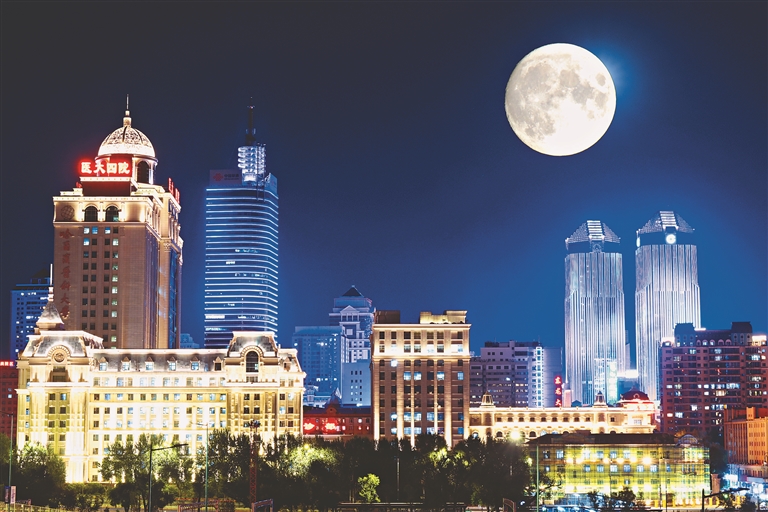 皓月当空 灯光和月光相映成趣,一轮满月高挂哈尔滨的天际,皎洁的月光将整个城市扮靓。 本报记者 郭俊峰摄
