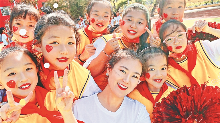 师生笑脸 齐齐哈尔市师范学校附属小学贾洪杰老师和学生一起分享笑脸。 本报记者 周姿杉摄