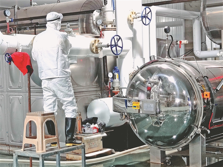 在有机绿色食品智能化产业园主会场,剥皮、切头去尾、高压清洗、高温蒸煮、冷却、速冻……宁安市华欣农业科技有限公司鲜食玉米深加工生产车间里一片繁忙景象,工人们正在流水线上不停地忙碌着。