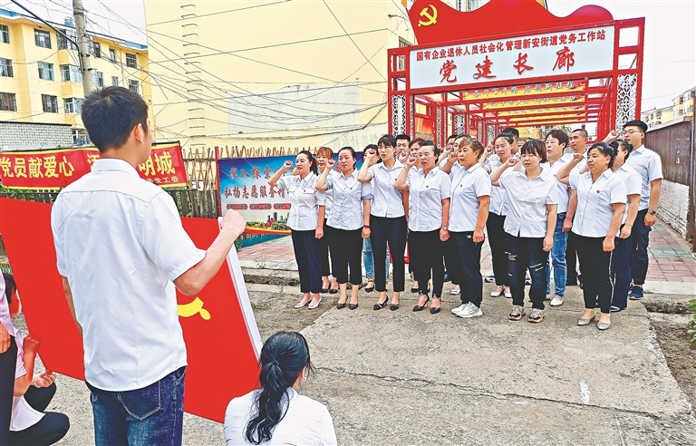 新安街道办事处的党员干部面对党旗重温入党誓词。杨军摄