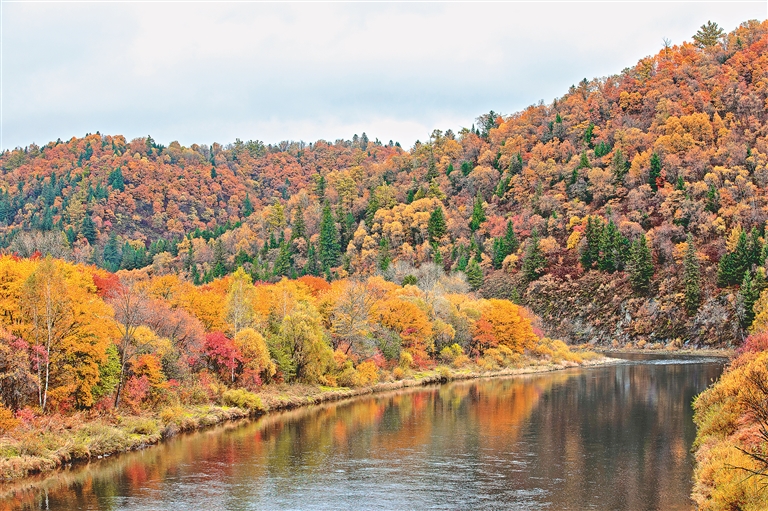 23日,农历传统节气秋分,火红的枫叶、苍翠的松枝、银白的瀑布……阵阵秋风把山林染成了五彩缤纷的颜色,美不胜收。在沾河林区,登上瞭望台,满眼秋色尽收眼底。见习记者 张春雷摄