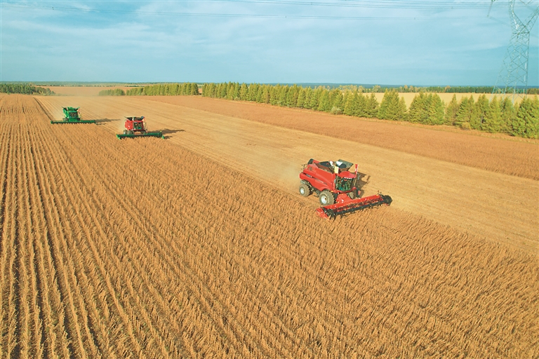本报讯(修晶 记者姜斌 刘畅)经历了春耕夏管,又到了金灿灿的大豆、沉甸甸的玉米高调出场的精彩时刻。近日,走进北大荒集团长水河农场有限公司的豆田,秋风阵阵吹过,27.06万亩大豆摇动着饱满的豆荚,一台台收获机往来穿梭,一曲丰收乐章正在黑土地上徐徐奏响。