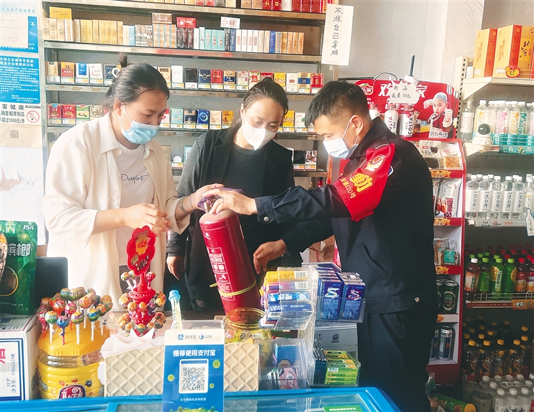社区警务助理和社区主任开展消防安全风险排查。