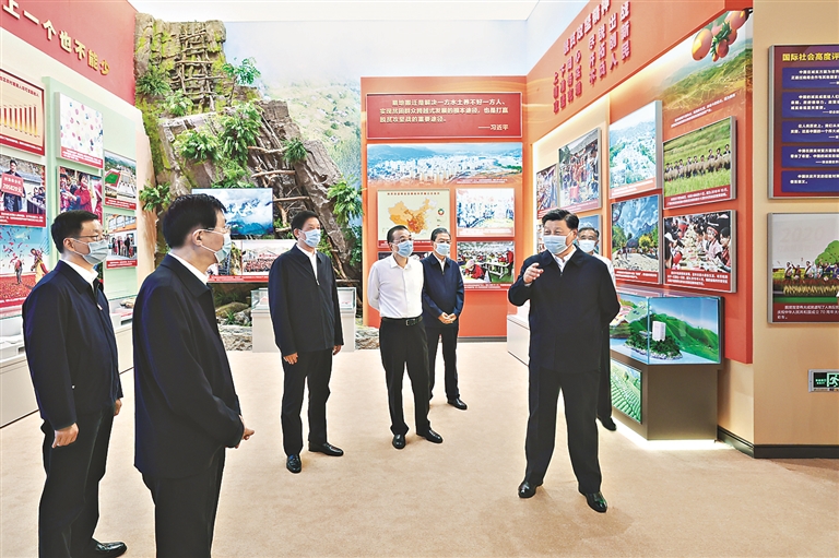 展示我国科技水平和制造能力跃升的自主研发关键产品实物、模型,反映功勋荣誉表彰体系日益丰富完备的勋章、奖章,国家级重大出版项目《复兴文库》,生动再现脱贫攻坚和抗击新冠肺炎疫情历史进程的实物、图表、图片,“五基”协同天空地一体化生态环境立体遥感监测体系模拟沙盘,武器装备模型,呈现总体国家安全观深刻内涵、党内法规制度建设成果的展板、实物,彰显京津冀协同发展成就的立体电子地图,展现规划建设、轨道交通和科技创新等方面亮点成果的粤港澳大湾区沙盘……一件件实物模型、一段段生动视频、一幅幅图片图表,吸引了习近平等领导同志的目光。他们不时驻足观看,听取讲解,询问有关情况。