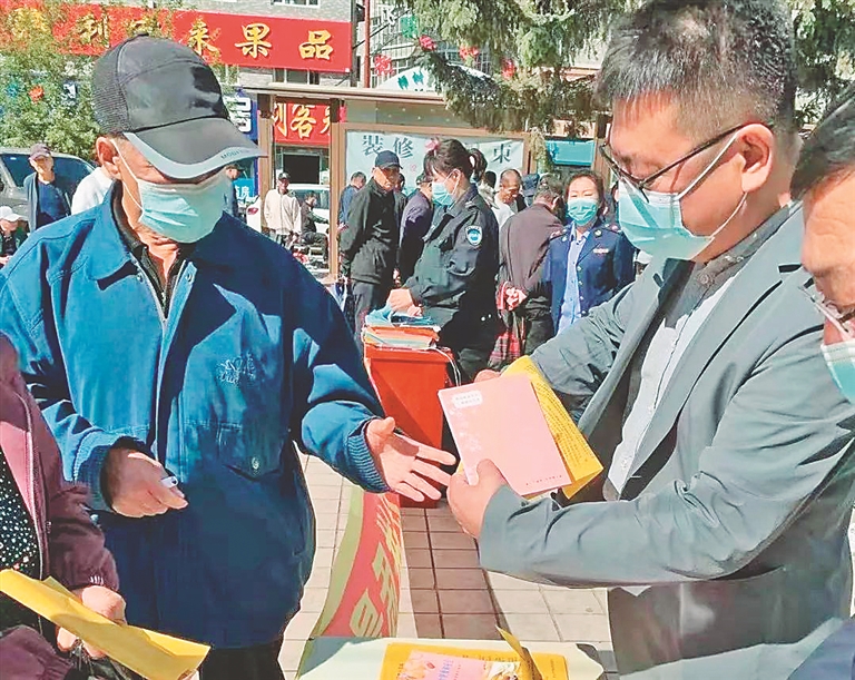 分发宣传单。崔佳 本报记者 刘柏森摄