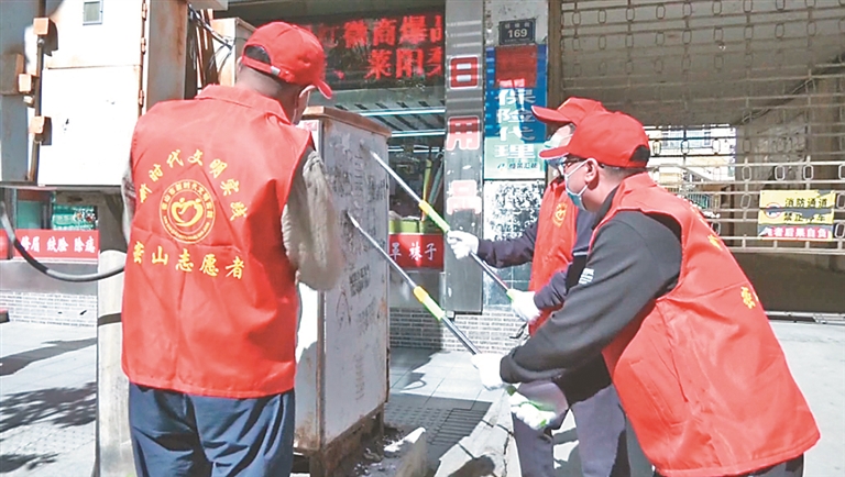 志愿者清除街头小广告。 黄新星 本报记者 刘柏森摄