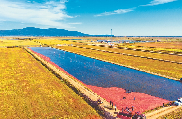 在抚远红海植业蔓越莓种植基地,浩瀚的蔓越莓田被注满水,脱落的蔓越莓果渐渐浮出水面,收获的人们仿佛置身于红色海洋,令人叹为观止。