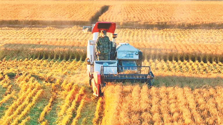 夕阳染稻田,美景入画来。走进桦川县玉成现代农机专业合作社的有机稻田,金灿灿的稻穗在轻风吹拂下显得愈发饱满成熟,伴随着现代化收割机的轰鸣声,一粒粒金黄的稻米被收割回仓。“今年气候比较平稳,而且还没有倒伏,水稻整体产量要比去年更好,预计每垧地将比以往多800斤至1000斤左右。”玉成合作社理事长李玉成算着收成,笑得合不拢嘴。