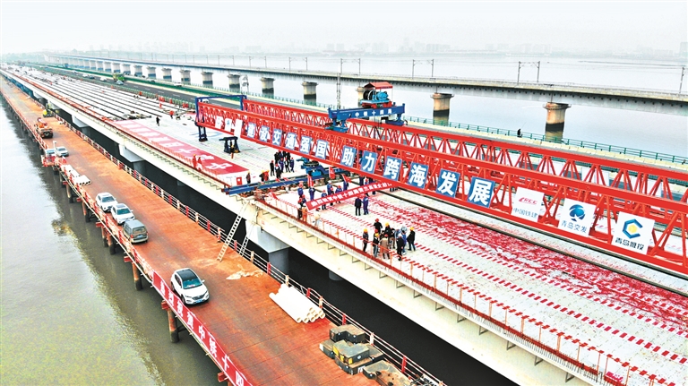 当日,国家高速公路网重要组成部分——青兰高速公路双埠至河套段女姑口特大桥顺利合龙,标志着青兰高速改扩建工程跨海段全线贯通。据介绍,该项目通车后青兰高速公路将增添一条8车道跨海大通道,有效提升与胶东国际机场立体交通互联互通能力。新华社记者 李紫恒摄