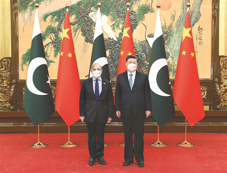 习近平介绍了中国共产党第二十次全国代表大会取得的重要成果。习近平指出,中国将继续坚持对外开放基本国策,不断以中国新发展为包括巴基斯坦在内的世界各国提供新机遇。中方愿同巴方深化发展战略对接。双方要用好中巴经济走廊联合合作委员会机制,以更高效率推进中巴经济走廊建设,将其打造成“一带一路”高质量发展示范性工程。要加快推进瓜达尔港配套基础设施建设,发挥港口对地区联通发展的辐射带动作用。双方要共同努力,为早日实施一号铁路干线升级改造项目和卡拉奇环城铁路项目创造条件。中方欢迎巴基斯坦扩大优质农产品对华出口,愿同巴方拓展数字经济、电子商务、光伏等新能源合作,扎实推进农业、科技、民生等领域合作,将继续为巴方稳定金融形势提供力所能及的支持。中方支持中国工业强省同巴方结对子推进产业合作,希望巴方提供良好营商环境。我高度牵挂在巴中国人的安全问题,希望巴方为赴巴基斯坦开展合作的中国机构和人员提供可靠安全环境。